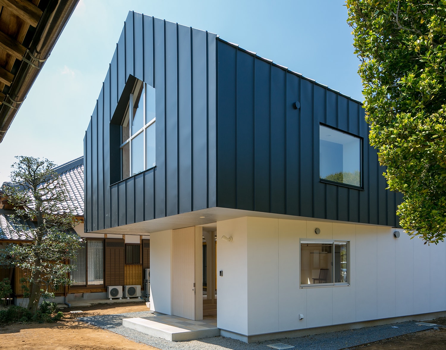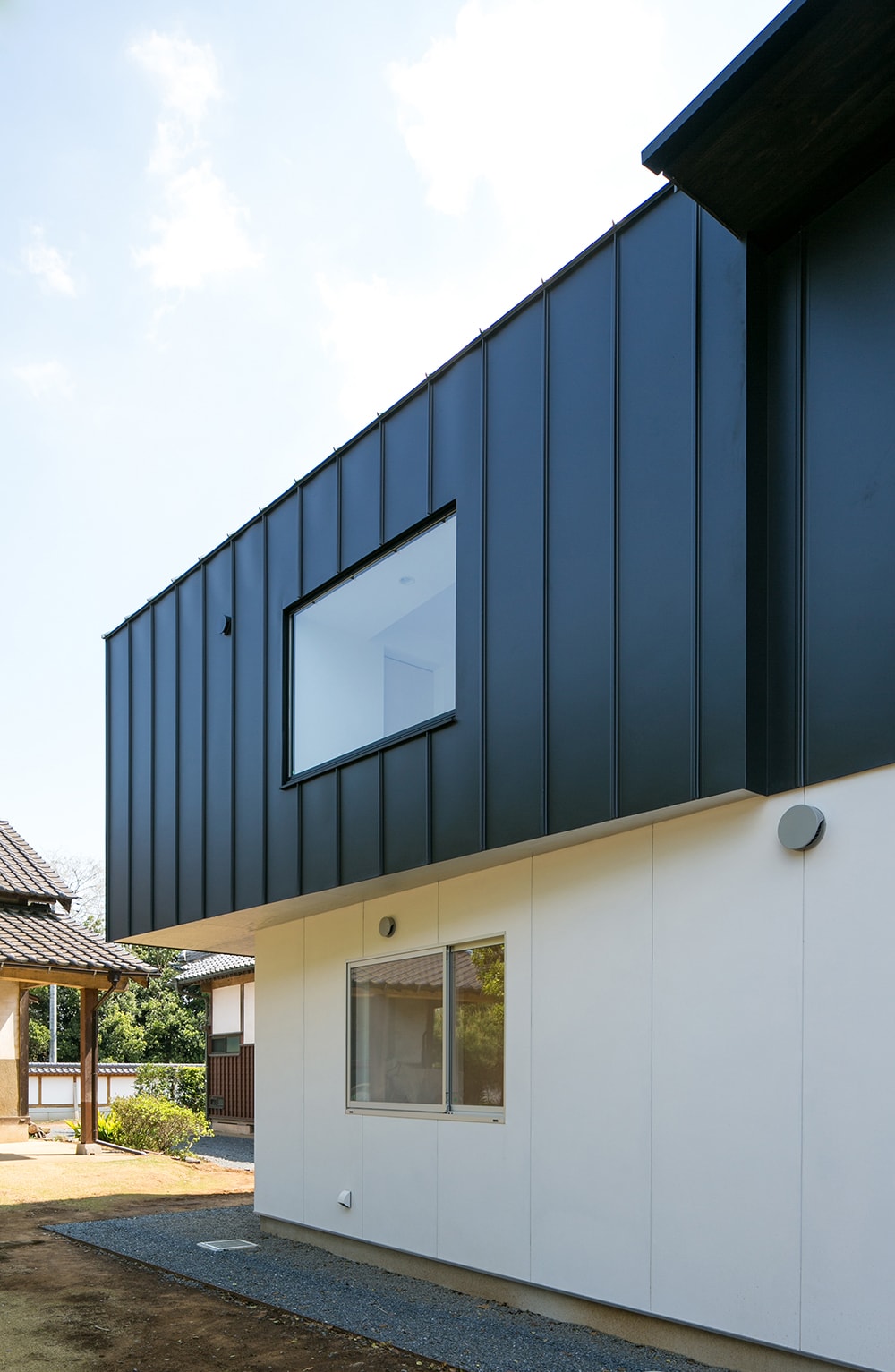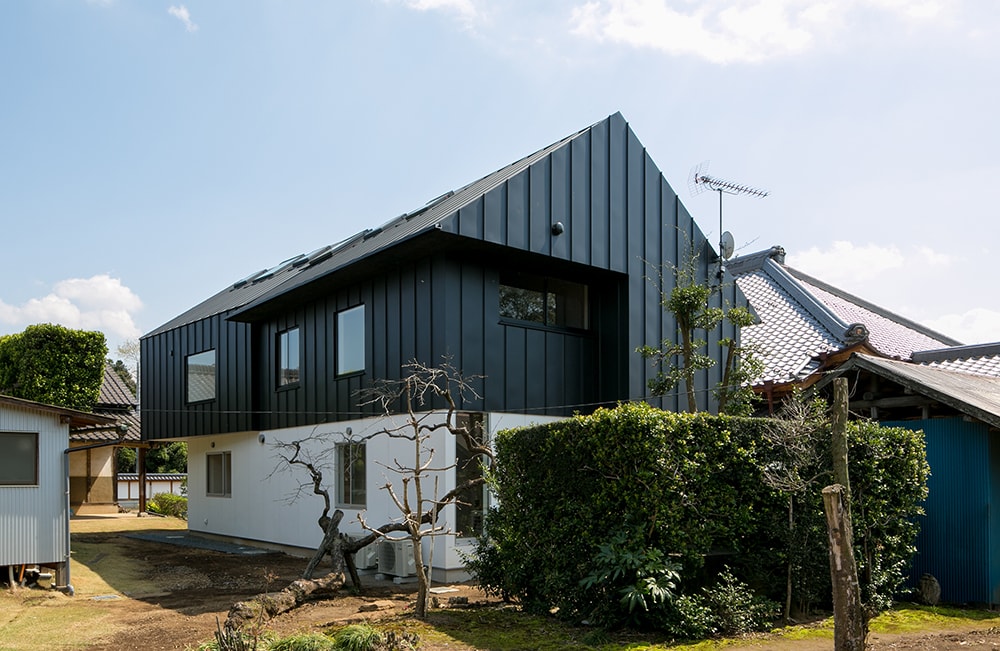 南側には母屋、北側には蔵と樹木、東側には納屋と広いように見えて狭い限られた敷地に立つ、家族3人+2人(予定)のための家族をつなぐ住宅です。
