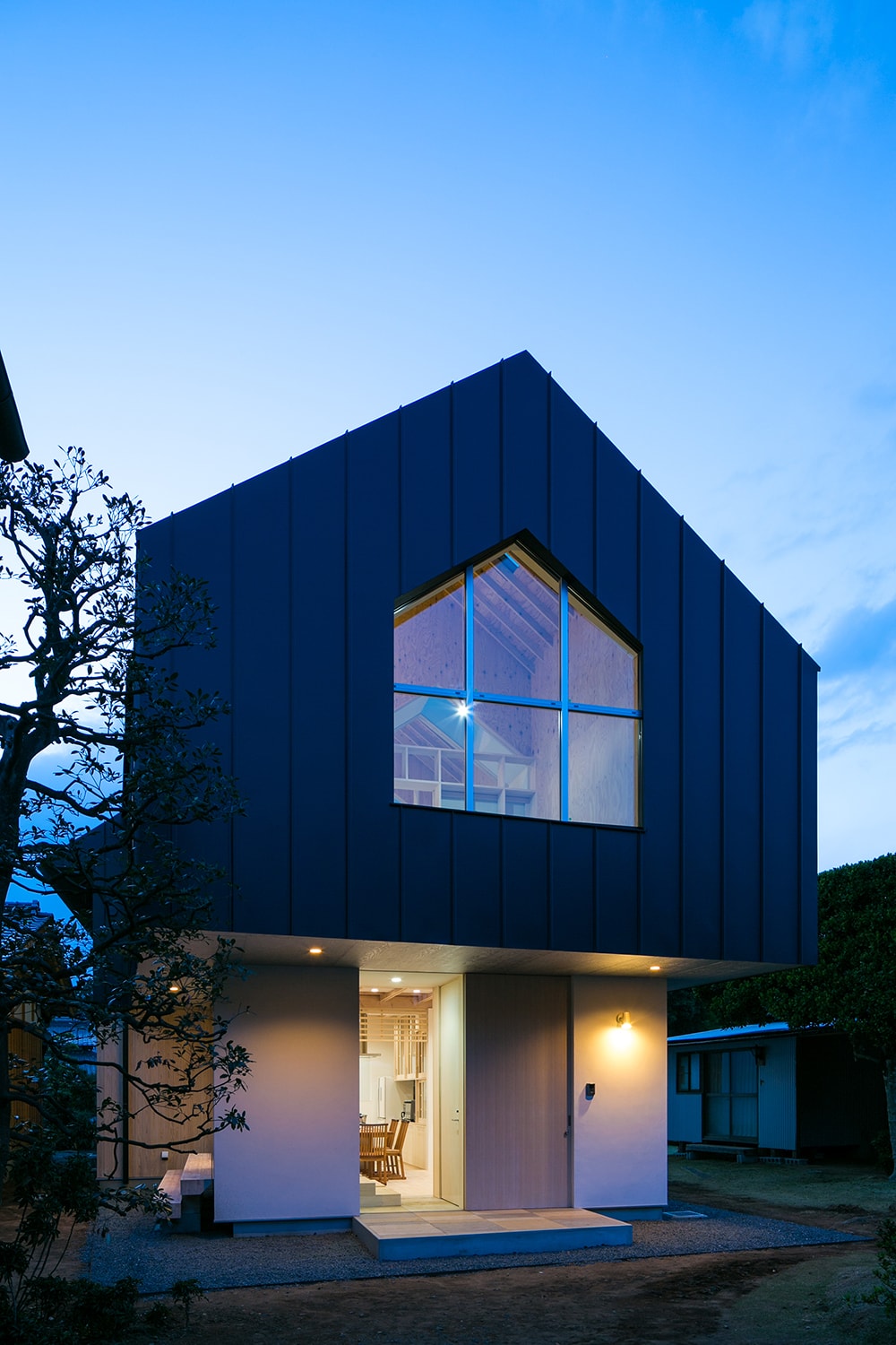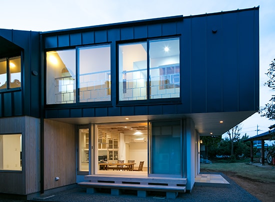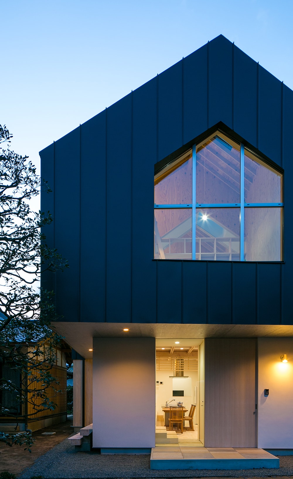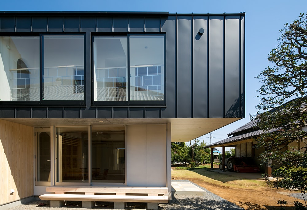 南側には母屋、北側には蔵と樹木、東側には納屋と広いように見えて狭い限られた敷地に立つ、家族3人+2人(予定)のための家族をつなぐ住宅です。