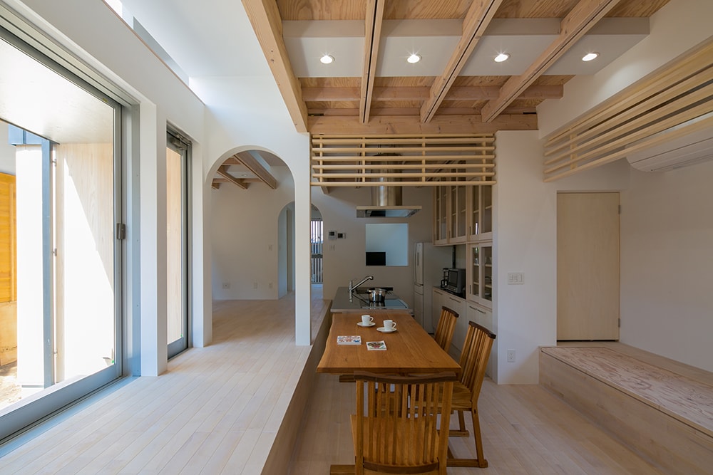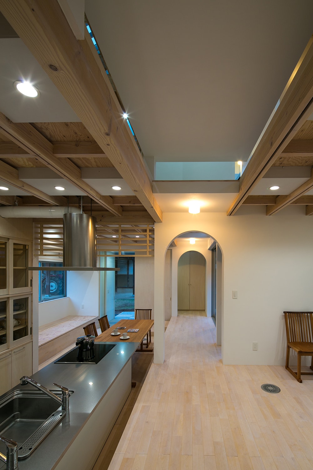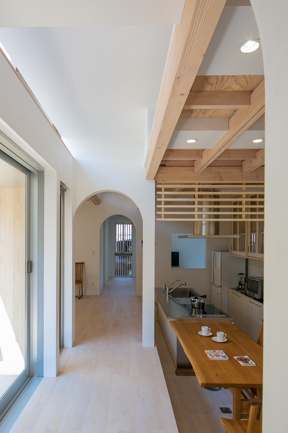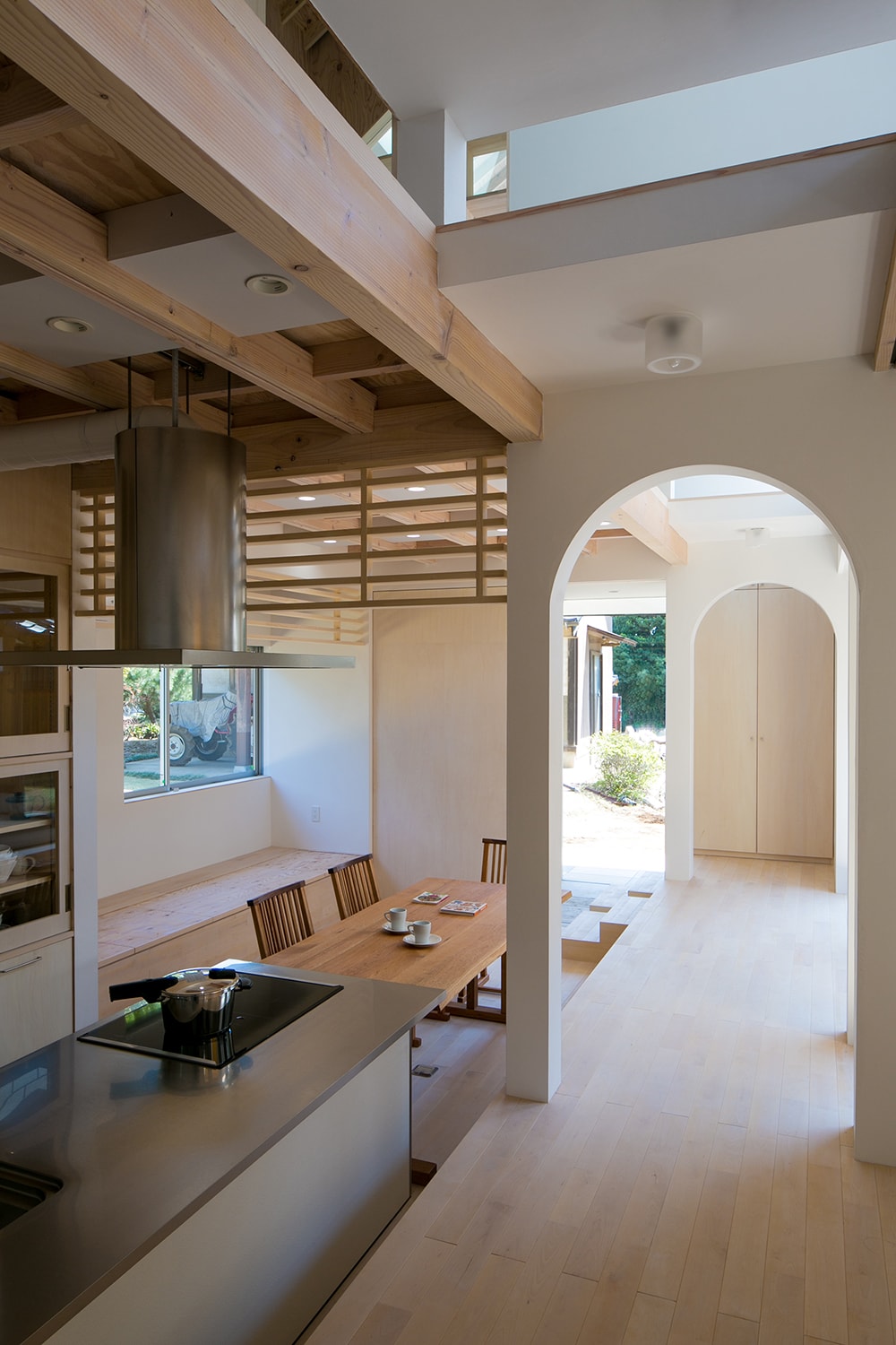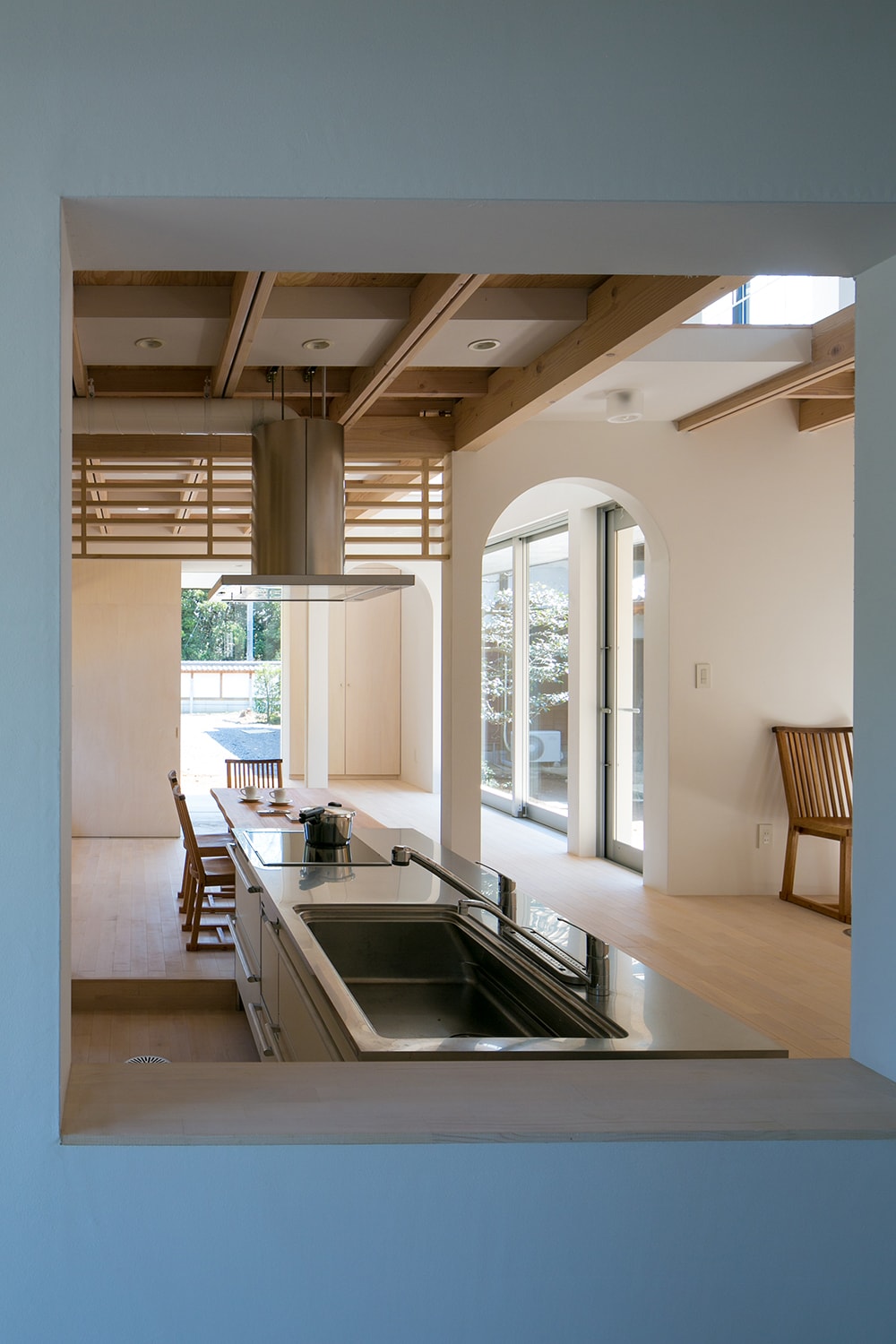 玄関からダイニング、キッチンへと続く堀の空間が家族の活動に多様性を与え、豊かな空間をつくります。キッチンを中心にして3つのスペースが緩やかにつながり、分節する、名前のない開かれた自由な場所です。