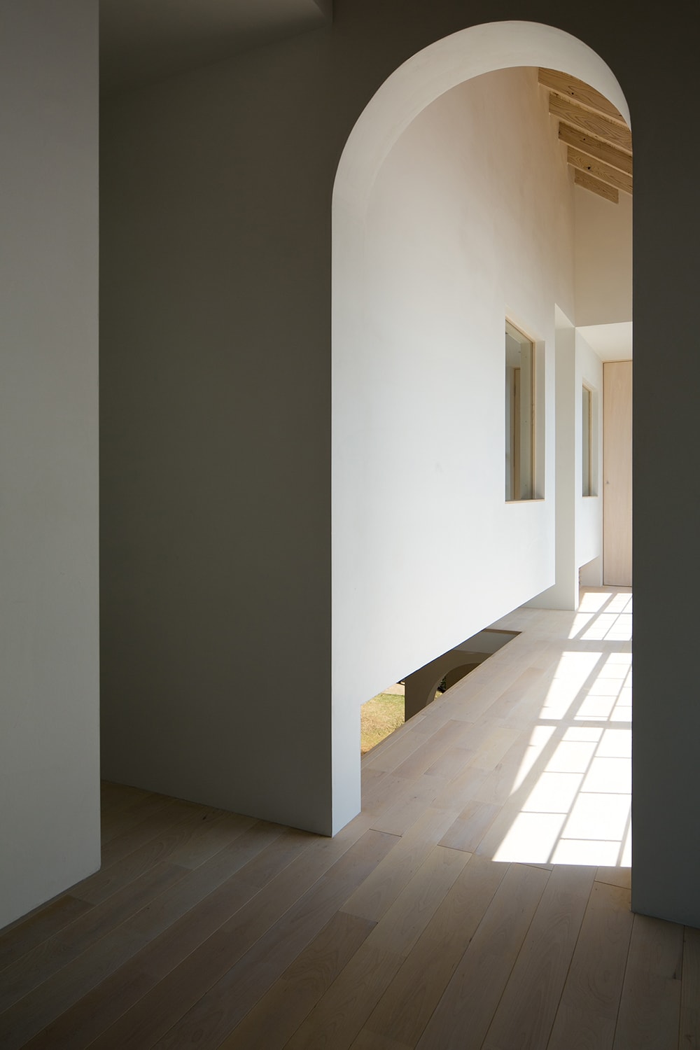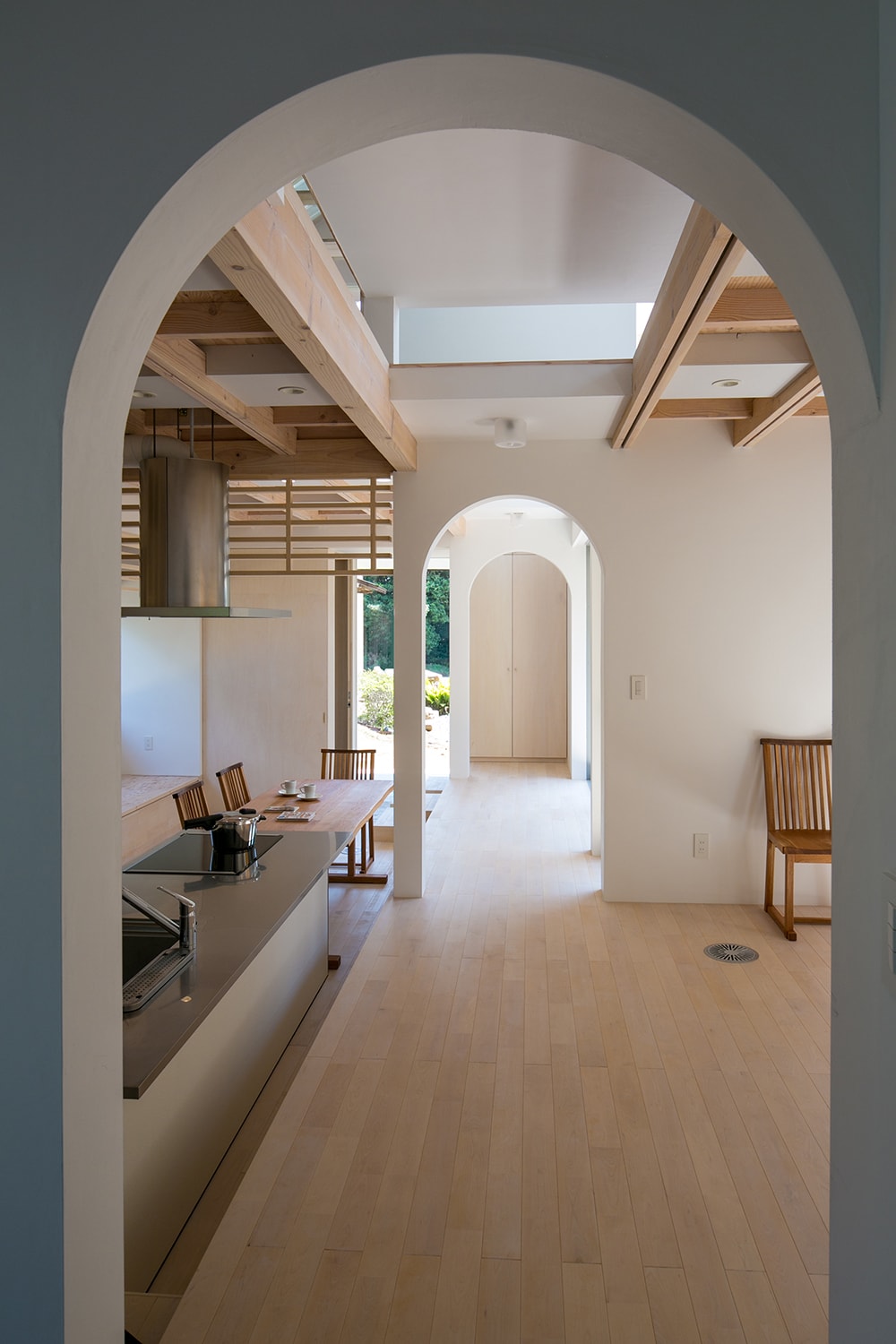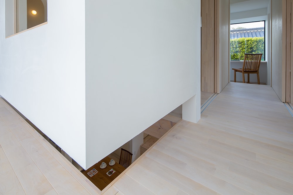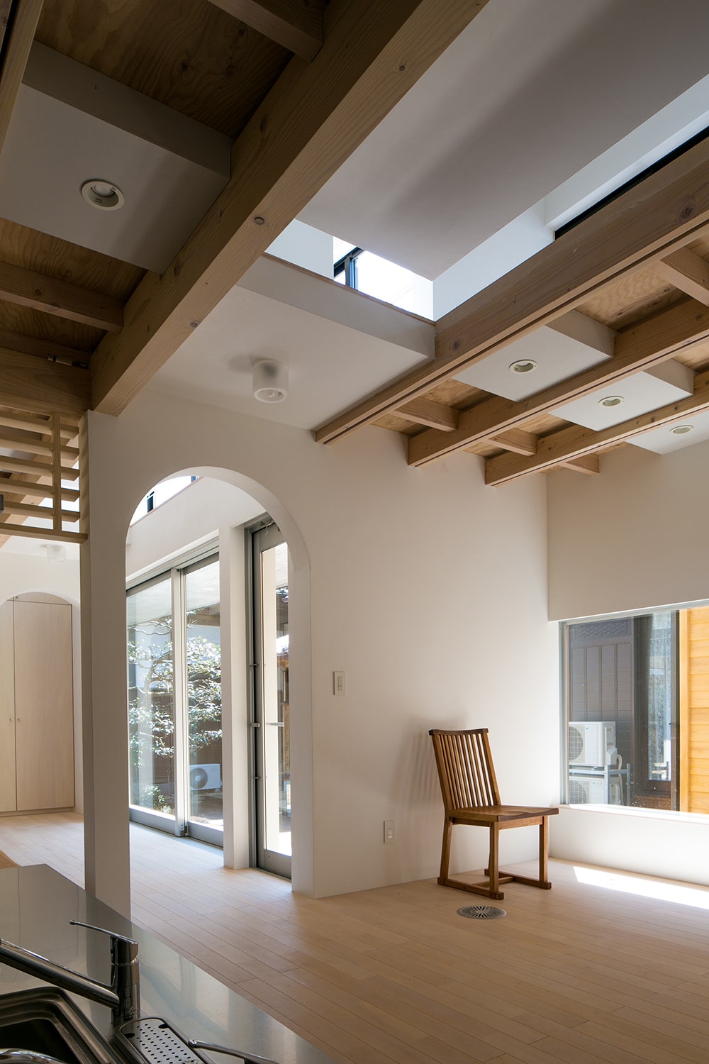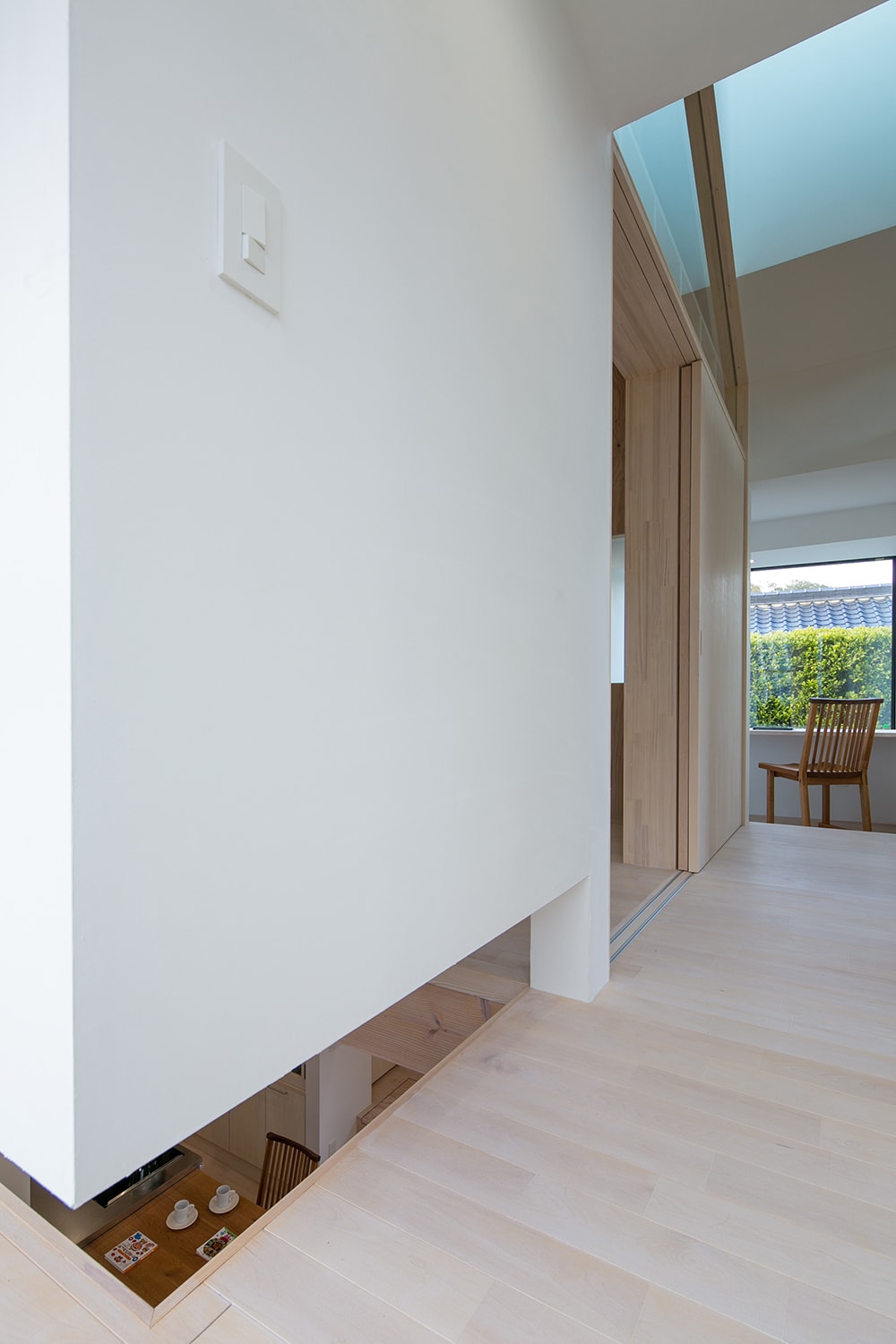 玄関からダイニング、キッチンへと続く堀の空間が家族の活動に多様性を与え、豊かな空間をつくります。キッチンを中心にして3つのスペースが緩やかにつながり、分節する、名前のない開かれた自由な場所です。