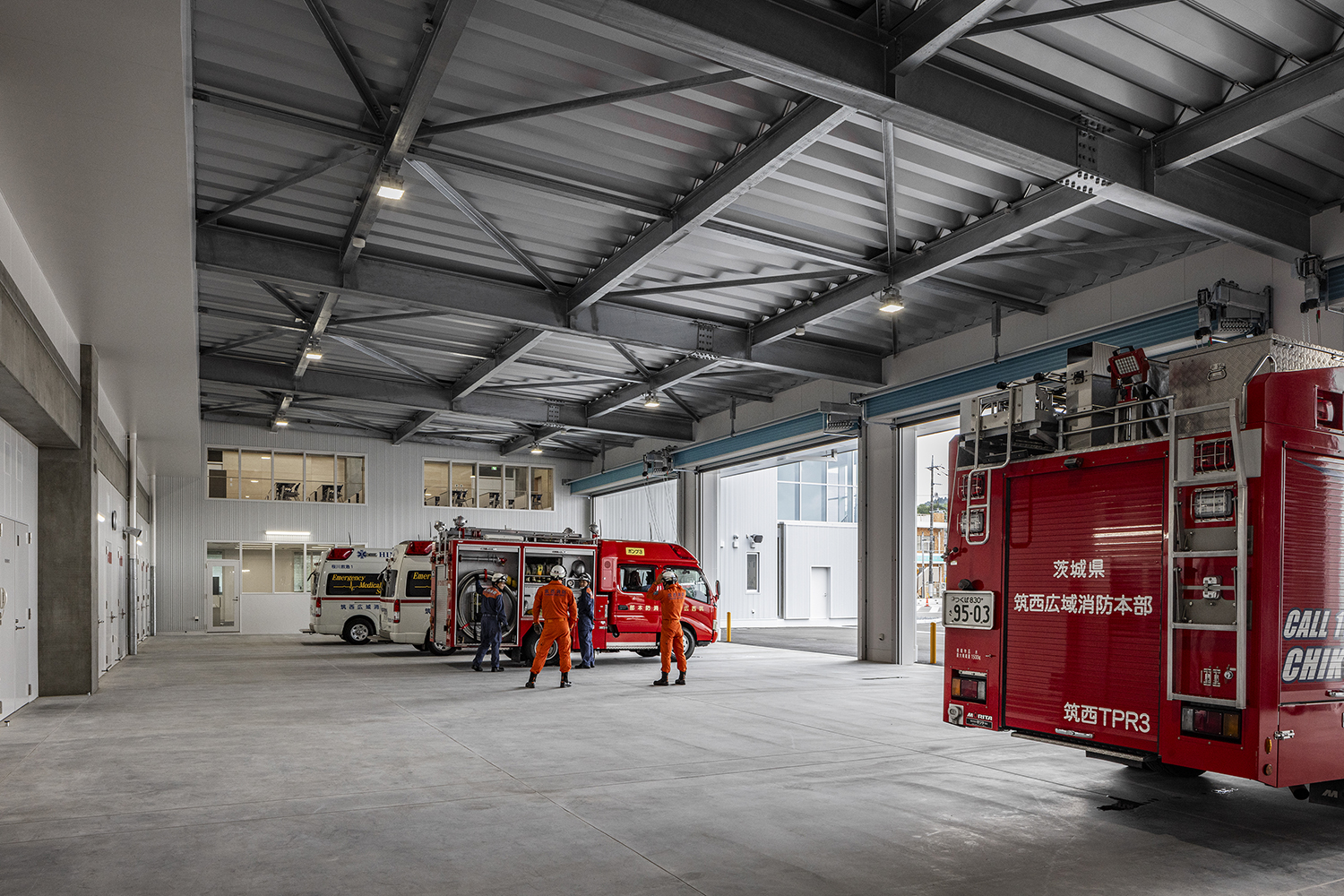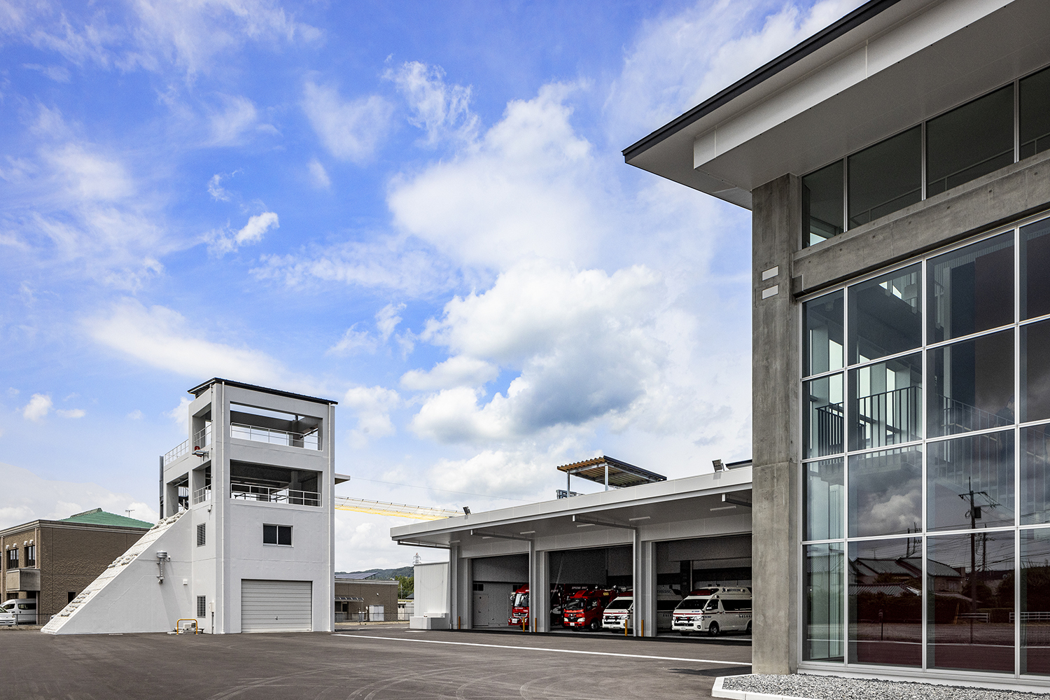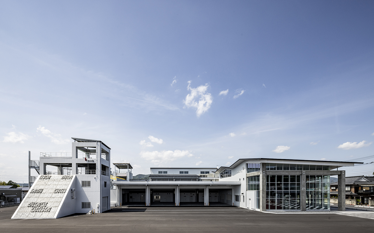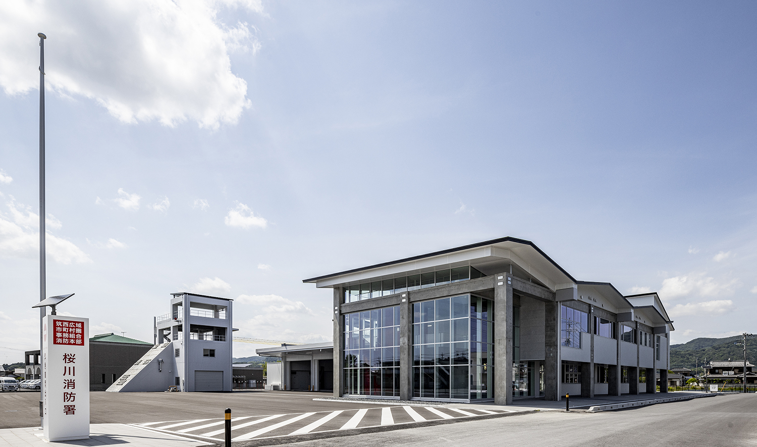 筑波の山々に相通ずるシンボリックさを持つ屋根と、地域社会に開かれた透明性を感じるガラス面の両方を備えたデザインの消防署です。折り紙を折り開いたような屋根は、軽やかなリズムと質感となり、周辺地域のランドマークとなる消防署となります。