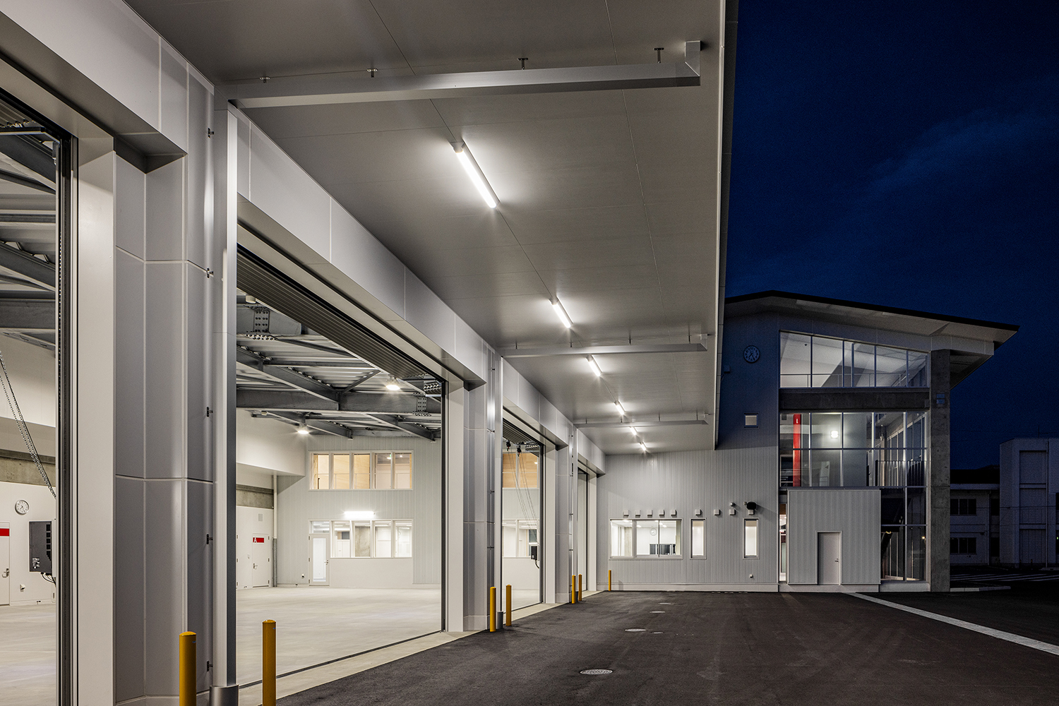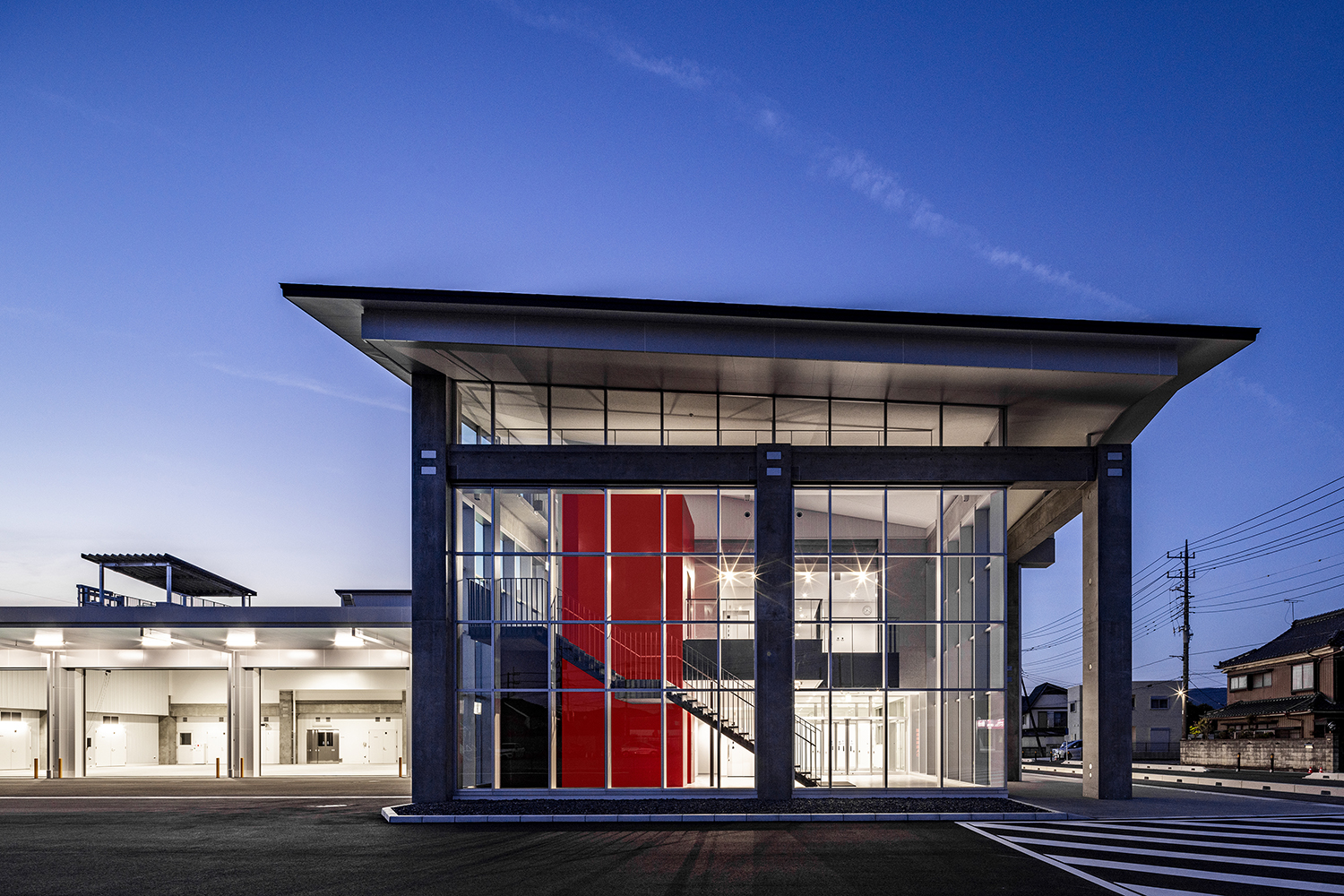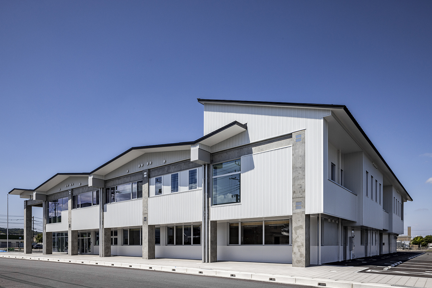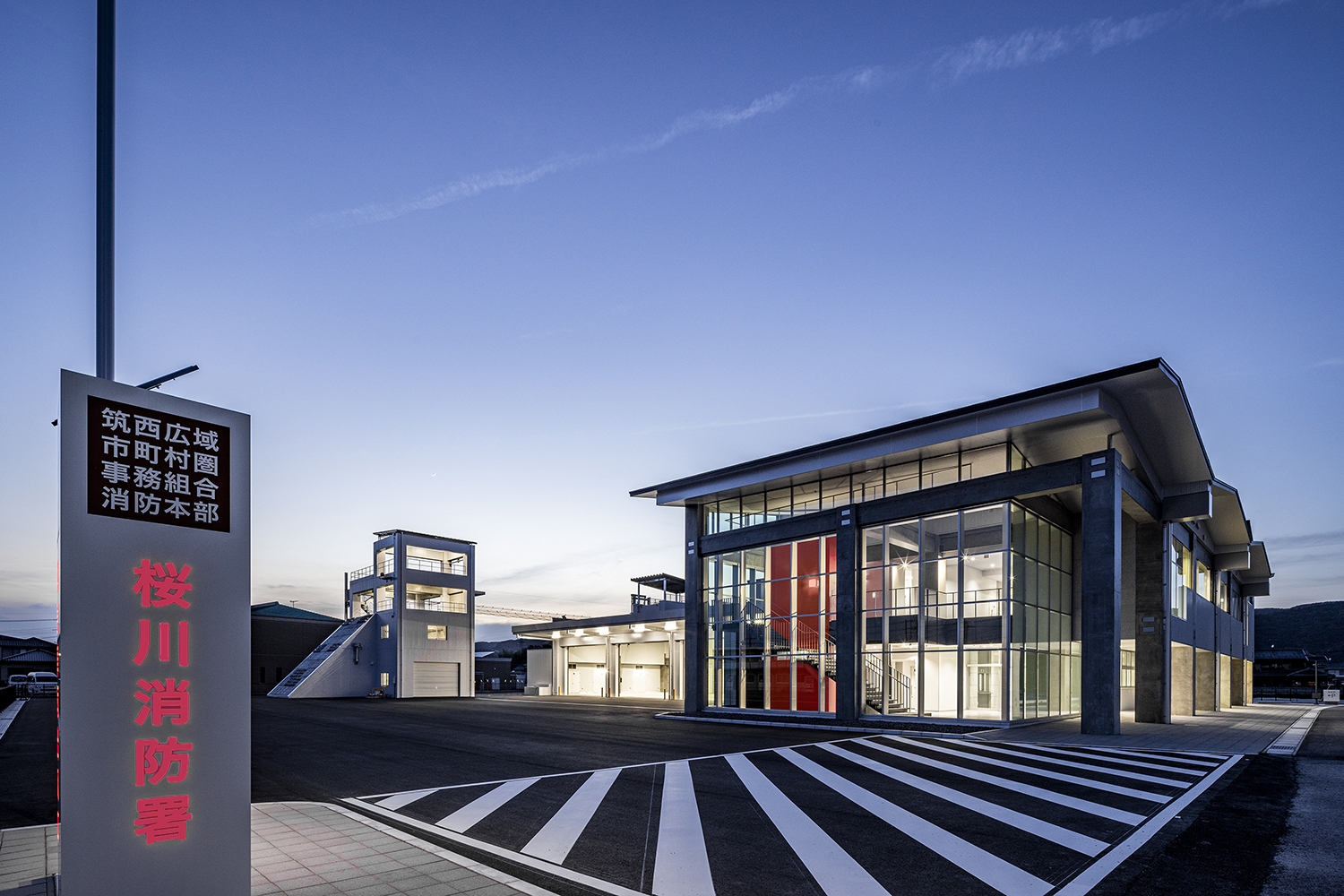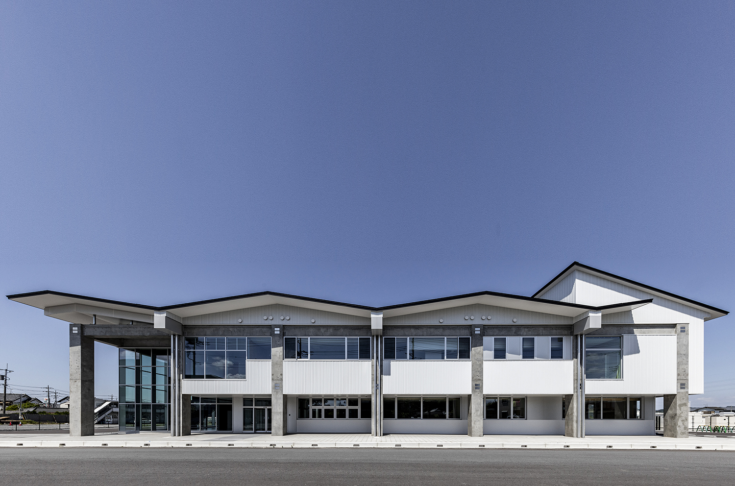 筑波の山々に相通ずるシンボリックさを持つ屋根と、地域社会に開かれた透明性を感じるガラス面の両方を備えたデザインの消防署です。折り紙を折り開いたような屋根は、軽やかなリズムと質感となり、周辺地域のランドマークとなる消防署となります。