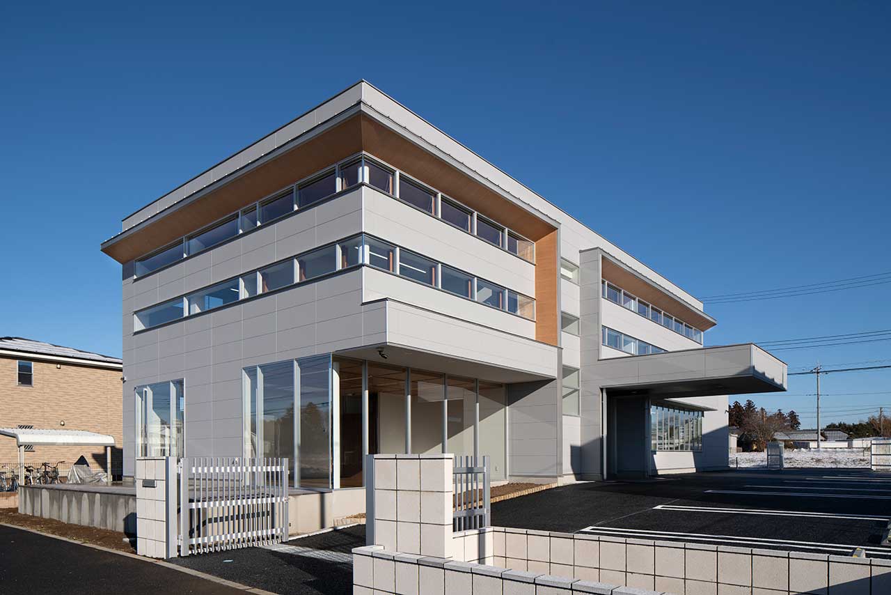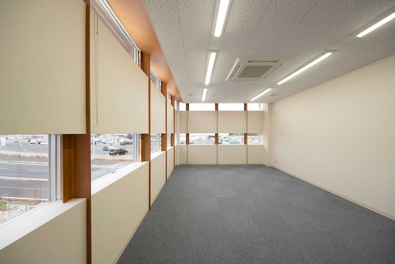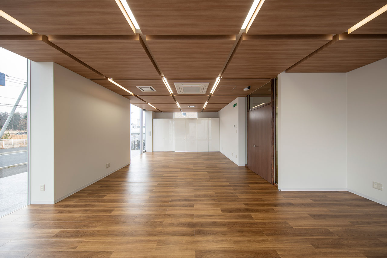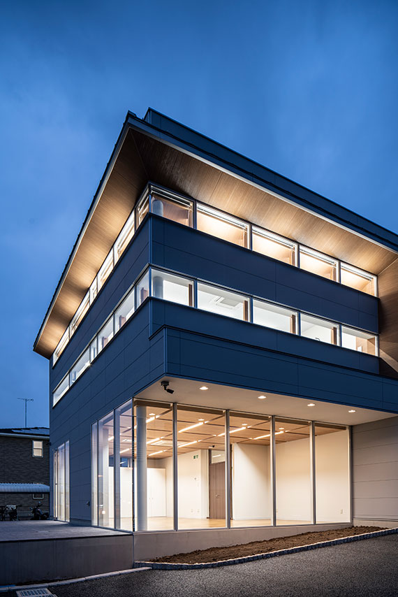 オフィスとしてシンプルでありながら、視線に配慮した連想窓で建物を構成し、建物に内外を有機的に連続させることで、地域や来訪者に対して、のびやかな企業イメージを印象付ける役割を持ったデザインとしました。