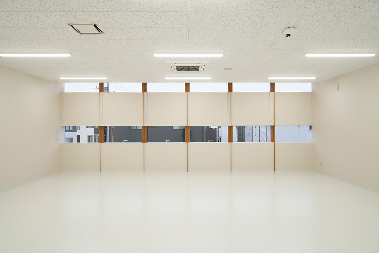 連想窓は、視線に配慮し上下に分けた構成としました。座った時には外の様子がわかる位置に窓を設け、光を取り込みながらも外からの視線を適度に隠せるオフィス空間としています。