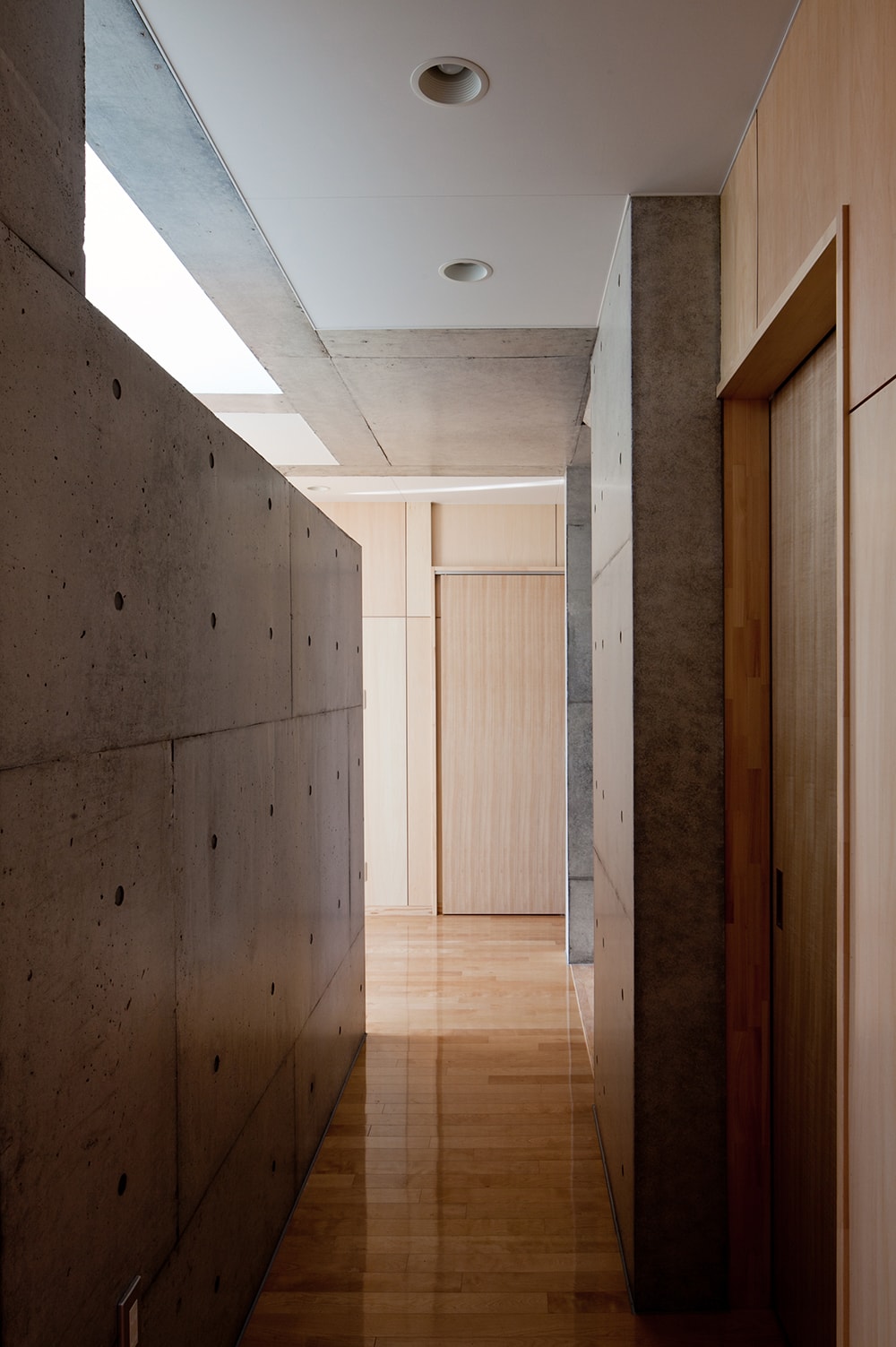 コンクリートの箱をずらすことによって生まれる間のスペースをガラスでつなぐことによって、光あふれるガラスの多目的空間をいえの中心に配置します。