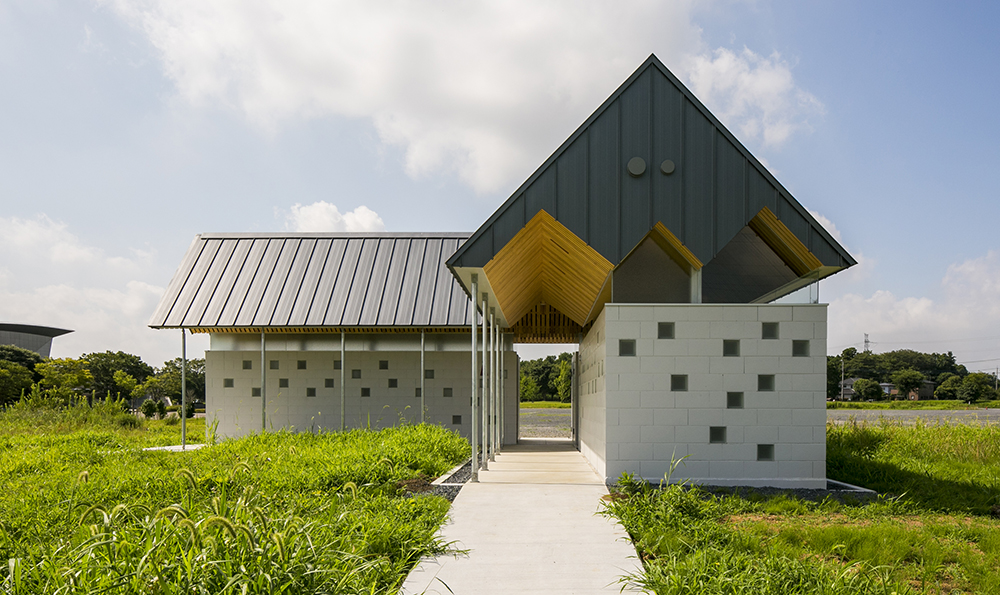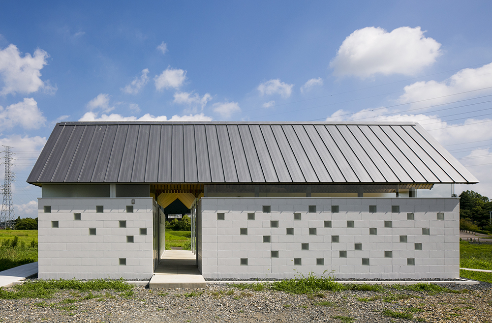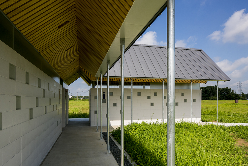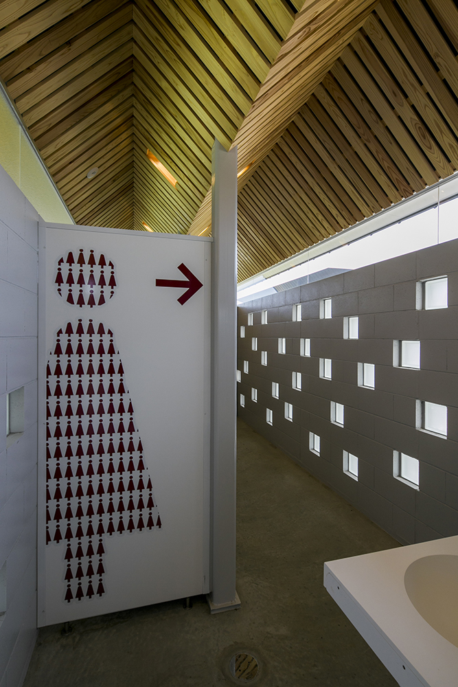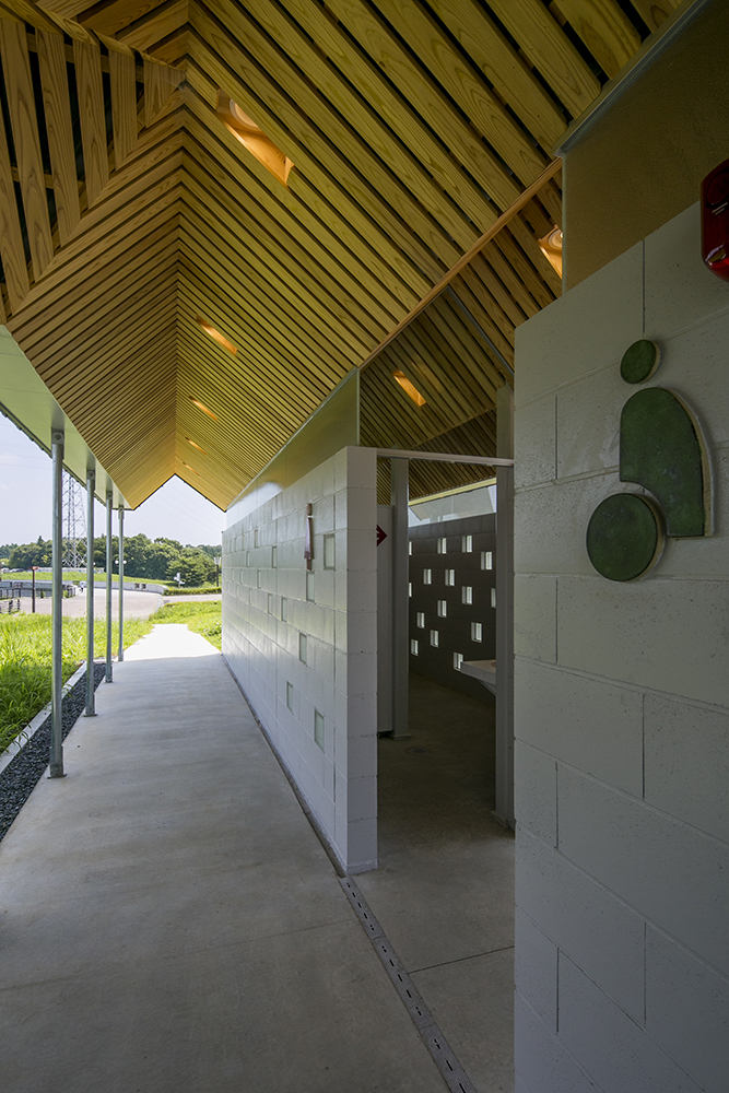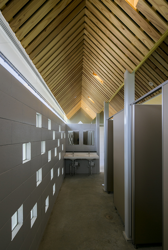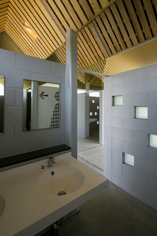 木立である鉄骨の柱がブースを仕切り、コンクリートとガラスのブロックを積み上げることにより境界を作り、枝となる天井を県産材の杉板で仕上げることにより、簡素な材料を使いながらも、屋根となる浮いた樹冠の屋根下で自然を感じることのできるトイレを実現しています。