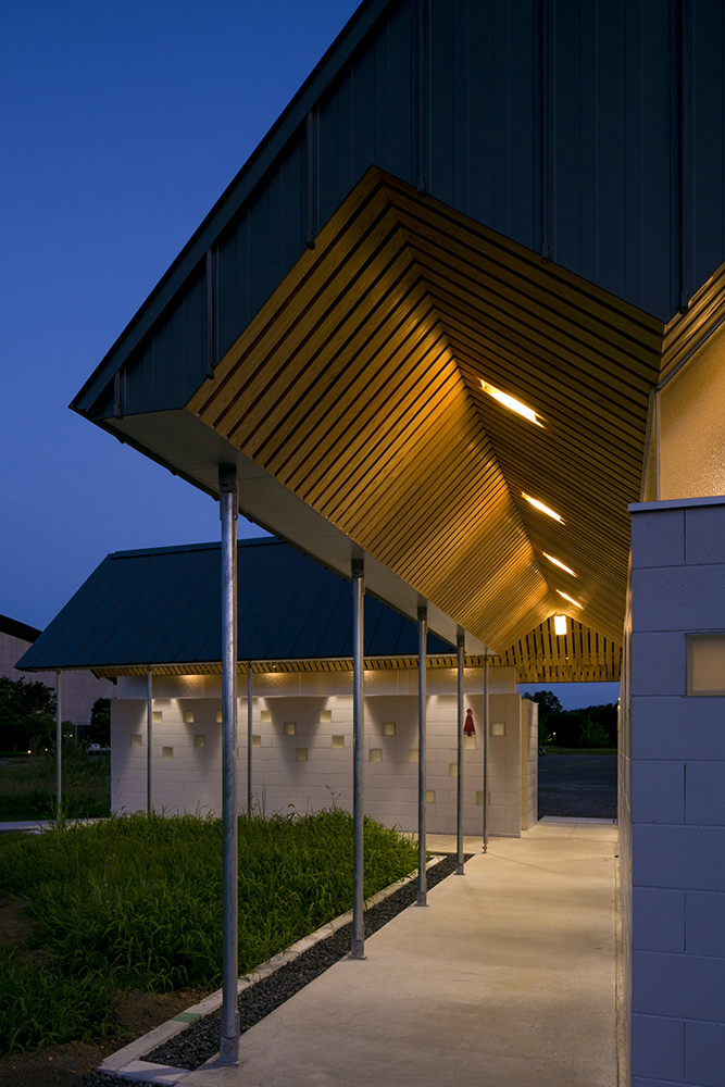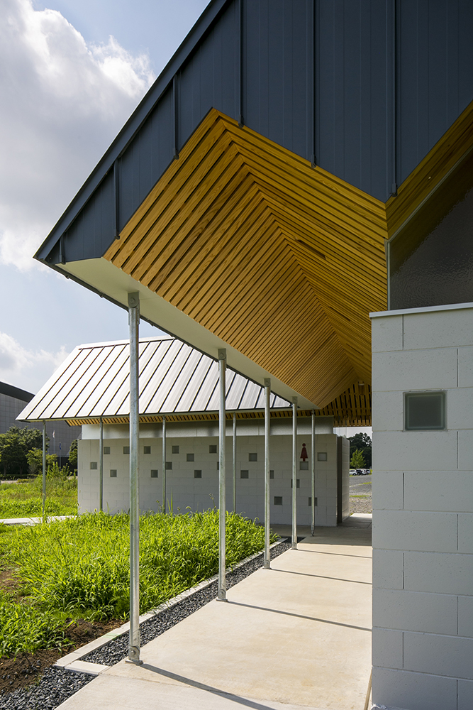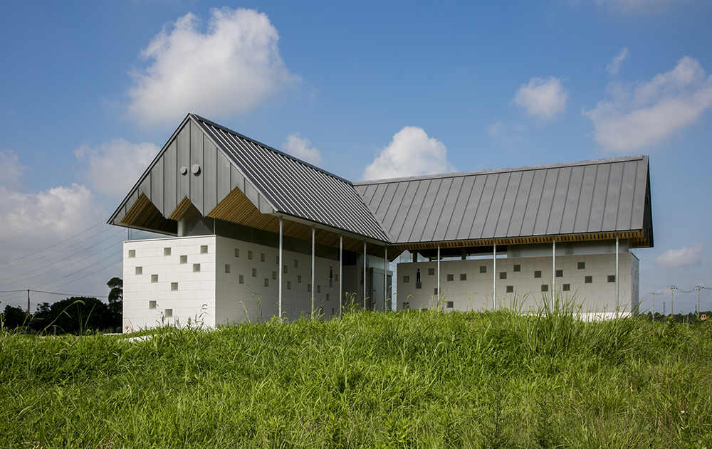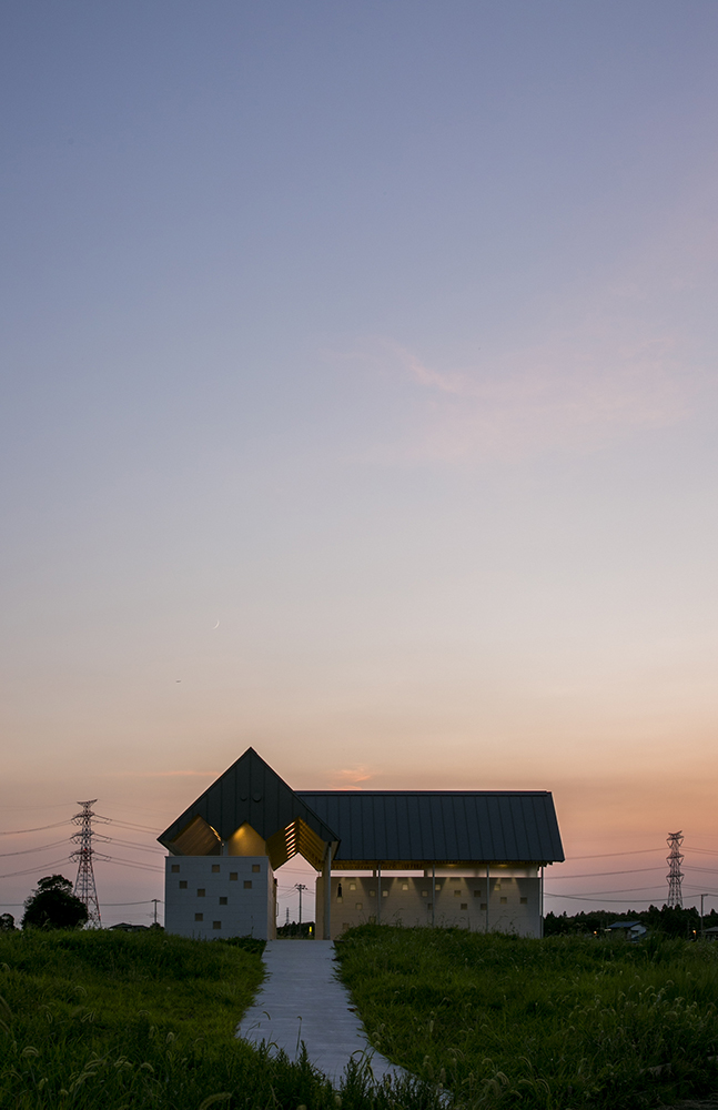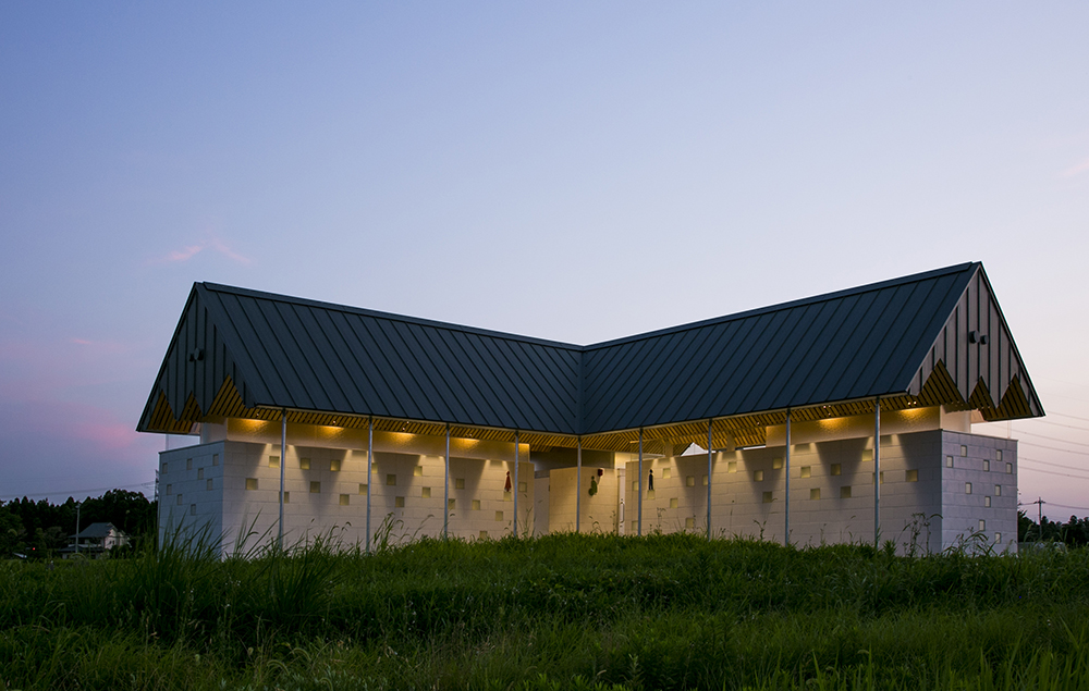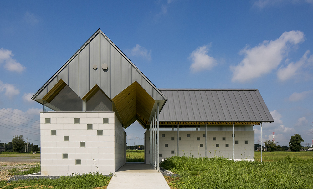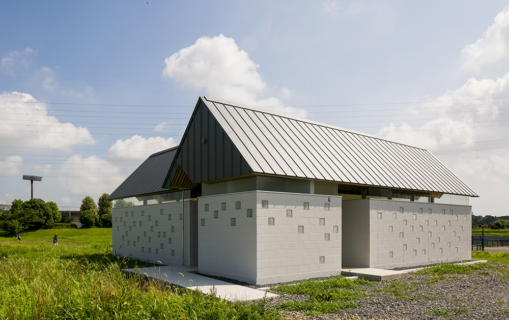 木立である鉄骨の柱がブースを仕切り、コンクリートとガラスのブロックを積み上げることにより境界を作り、枝となる天井を県産材の杉板で仕上げることにより、簡素な材料を使いながらも、屋根となる浮いた樹冠の屋根下で自然を感じることのできるトイレを実現しています。