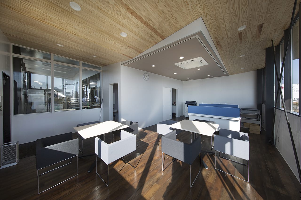 限られた面積のなかで開放感をもたせるため、景色や自然光を取り込みながらも、外部からの視線を遮りつつ、内装には天井に木材を取り入れることで柔らかな空間を実現しました。