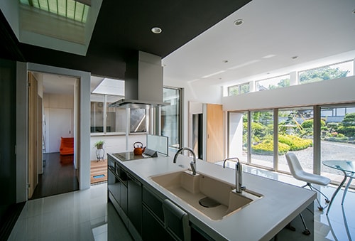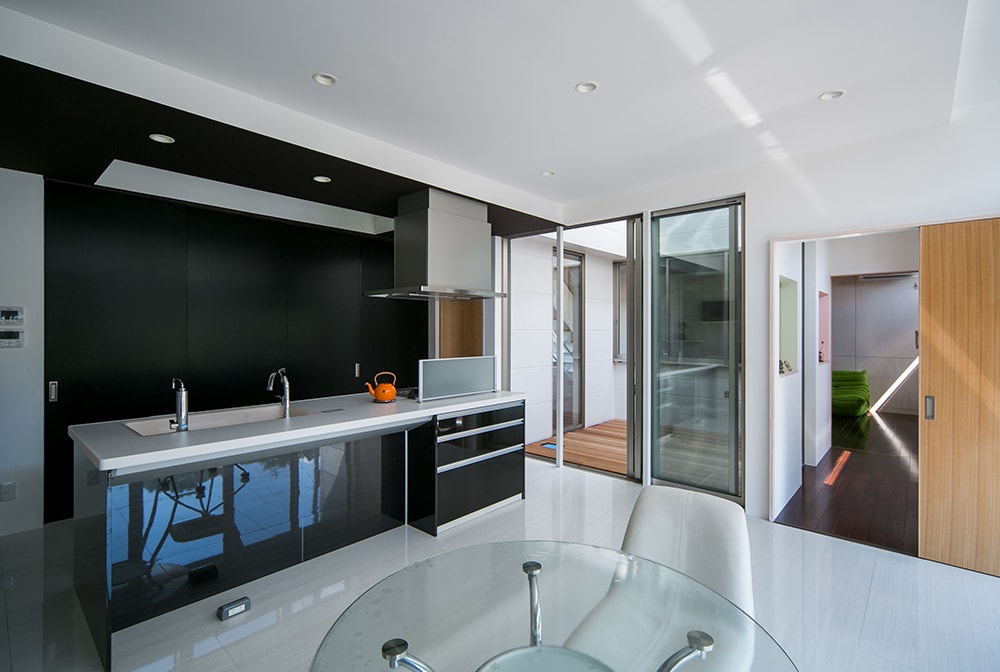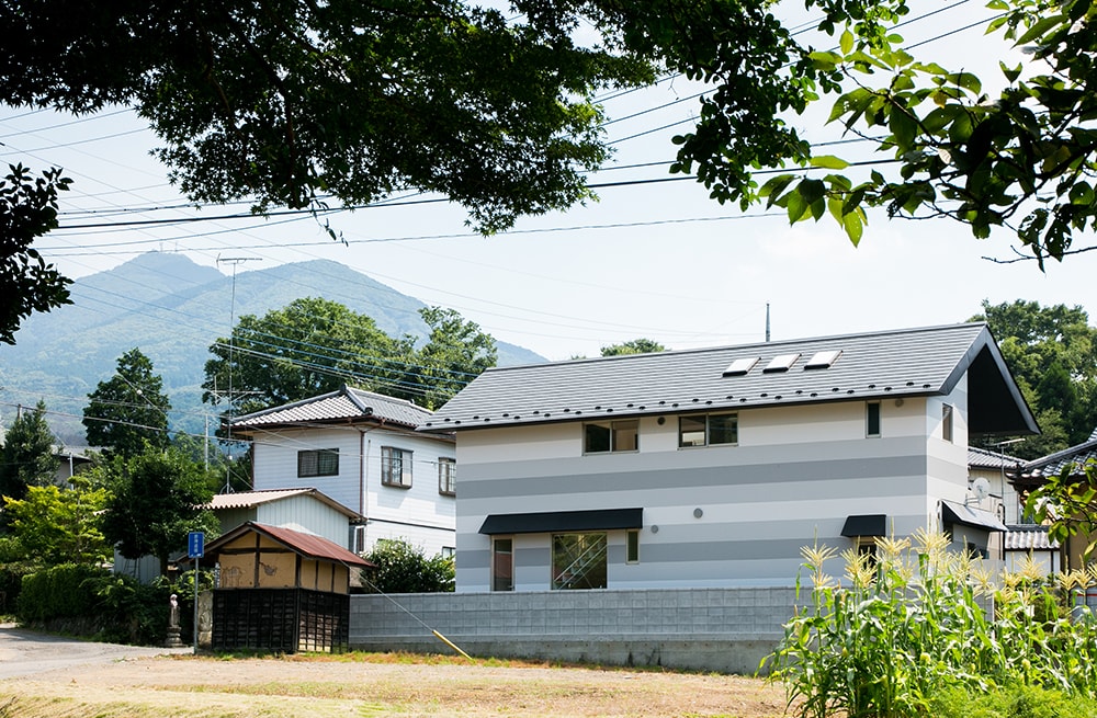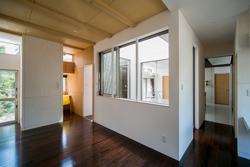 加波山麓の西斜面に立つ、住宅の真ん中に配置した中庭から、光が内部空間全体に降り注ぐ、光あふれる住宅です。中庭と各スペースに設けた開口部が光や風を呼び、できるだけ自然エネルギーでの生活の実現を目指しています。