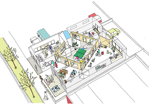 入り口も機能もばらばらだった建物と建物の間に生まれる路地空間を、みんなが最初に集まるコミュニティパークとして再生します。コミュニティパークを中心に、3つの建物と外と内のスペースを緩やかにつなぎ、みんながここに集まり、そこからいろいろなスペースへ広がっていく。